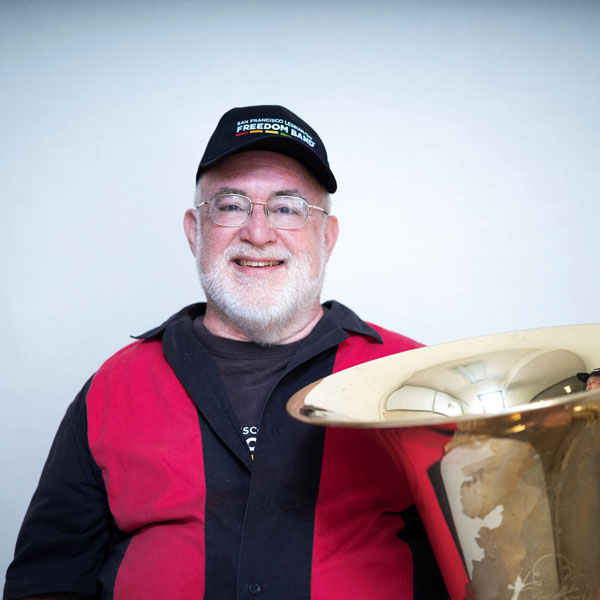 I have participated in every SF Pride Parade since I moved to California in fall of 1976, but I had convinced myself that, much as I loved to get back involved with music, which I had given up during my college years for computer and electrical engineering studies, a 70-mile round-trip to rehearsals every week during commute hours was just too much. It took me 9 years and a story involving the 1984 KFJC Radio “Louie, Louie” Marathon, a rental Sousaphone, and a “threat” from my lover Gary to make me realize I needed to just do it. So I approached the Band at their booth after the 1987 Pride Parade, and the rest was history. I’m very happy that the Band was able to keep itself together for those nine years without me, and am heartened to see that we are still going strong after 40. I’m looking forward to the big 50th Anniversary Celebrations to come!
