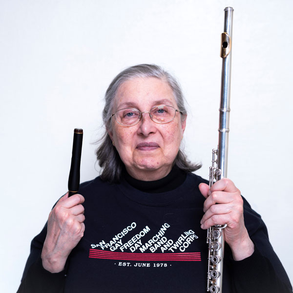 I heard an advertisement on the radio for an SFLGFB concert years before I was invited to join (and consider this your invitation to come and play, or attend a concert!), made it to the next rehearsal, and now I’ve been a member of the flute section since 1996. Although I make music with many other groups, the Band is my musical home and family. How amazing to be able to share my passion for music while Playing with Pride for community and social justice!