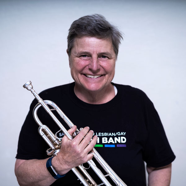 Twenty years ago at SF pride I was working at the Olivia booth which happened to be adjacent to SFLGFB’s booth. I was SO excited to see the uniforms the instruments and band members, I put my name on their list. When I attended my first rehearsal I felt so accepted and supported as a person and musician- Instant family! I’ve played trumpet most of my life and after a 14 year hiatus the band inspired me to recommit to my passion for music. The band has led to many opportunities for me. I currently play with multiple community groups ranging from orchestra to jazz. One of my great joys is inspiring others to pick up their instruments. In my spare time I enjoy helping others, good food, playing music with friends and walking dogs.