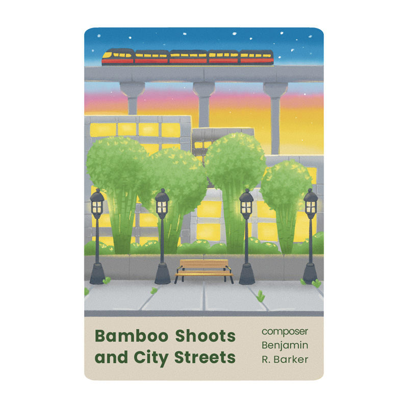 Bamboo Shoots and City Streets takes you on a journey from a bamboo forest to its urban analog, a modern cityscape. Caribana Afterparty features Caribbean-inspired rhythms that evoke the drive to dance, a fundamental urge to move that is at the heart of human connection. These pieces and more tell the musical story of how we move through the world.